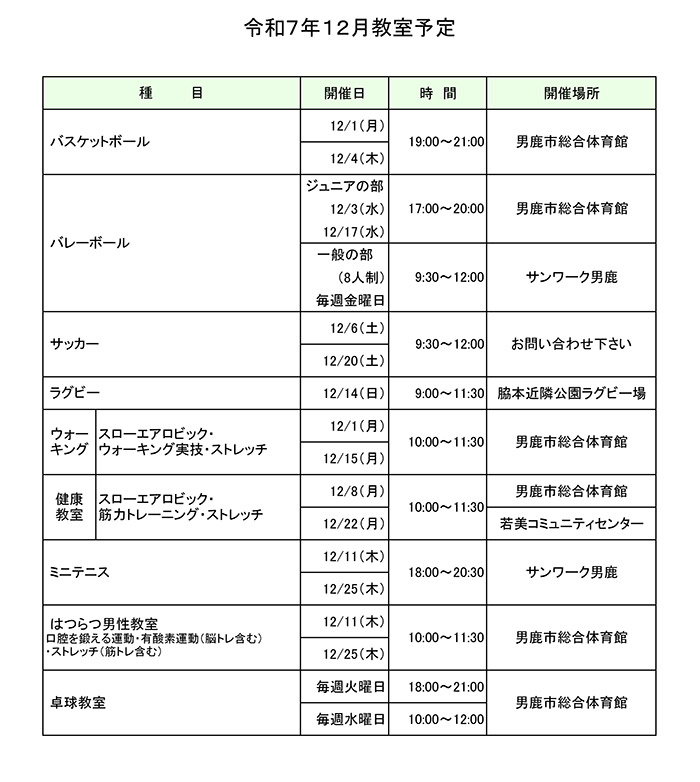 | 男鹿市総合型地域スポーツクラブ 教室予定 |
